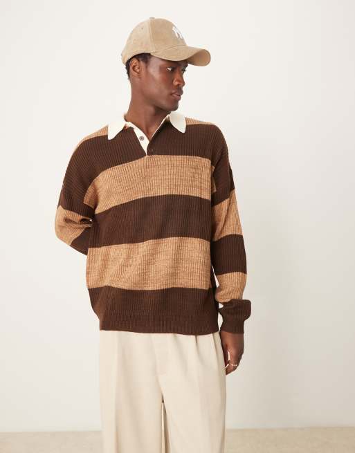 ASOS DESIGN relaxed knitted rugby polo in brown marl stripe
