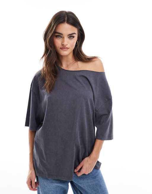 ASOS DESIGN relaxed off shoulder tee in washed charcoal
