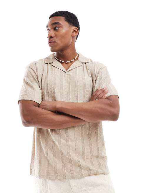 ASOS DESIGN relaxed polo with revere collar in beige textured stripe