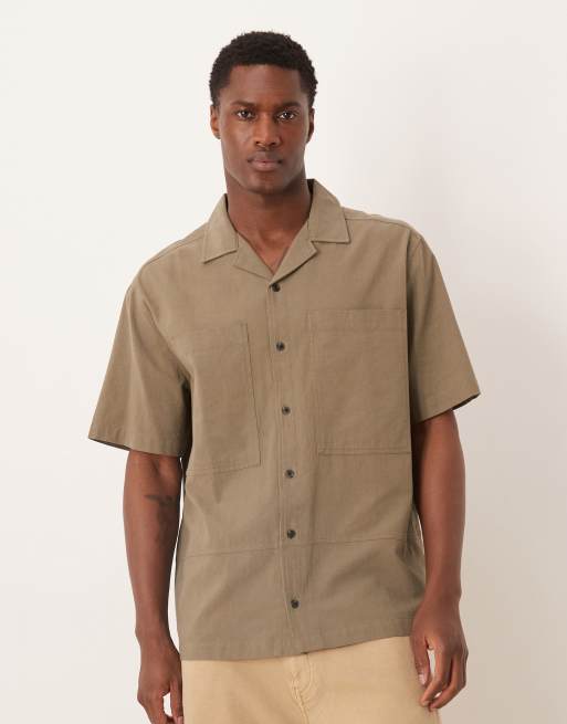 ASOS DESIGN relaxed revere cotton shirt with chest pocket detail in khaki
