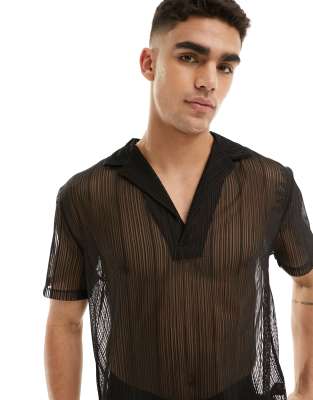 ASOS DESIGN relaxed revere neck polo in black laddered mesh