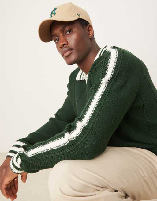 ASOS DESIGN relaxed ribbed knitted polo jumper with tipping and seam detail in dark green