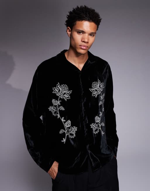 ASOS DESIGN relaxed velvet shirt with floral embroidery in black