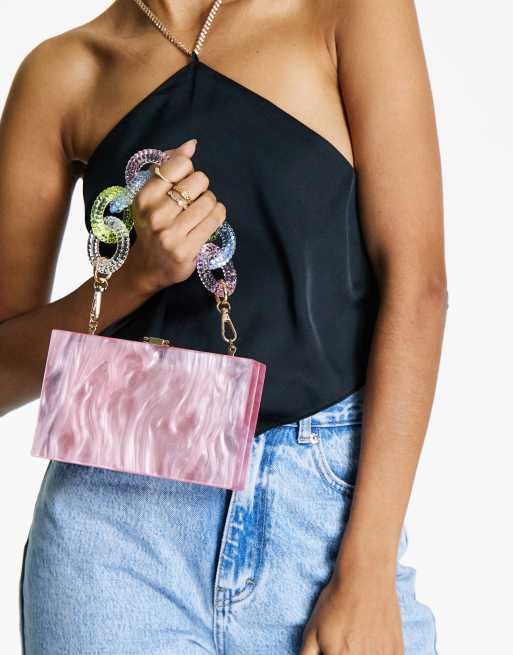 ASOS DESIGN resin clutch bag with detachable multi coloured chain in pink