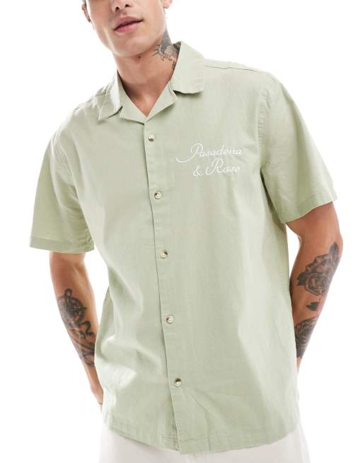 ASOS DESIGN revere shirt with chest embroidery in sage green