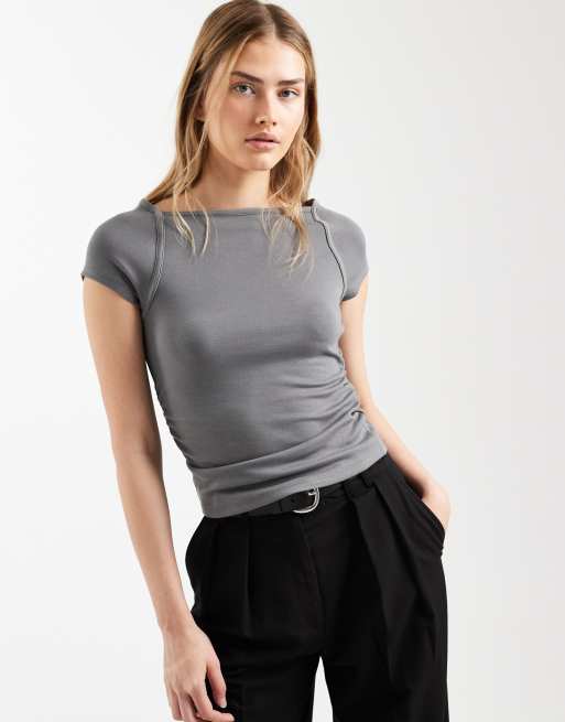 ASOS DESIGN rib cap sleeve ruched detail t-shirt in charcoal