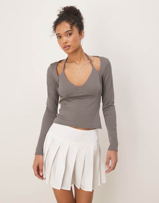 ASOS DESIGN rib halter neck long sleeve top in grey