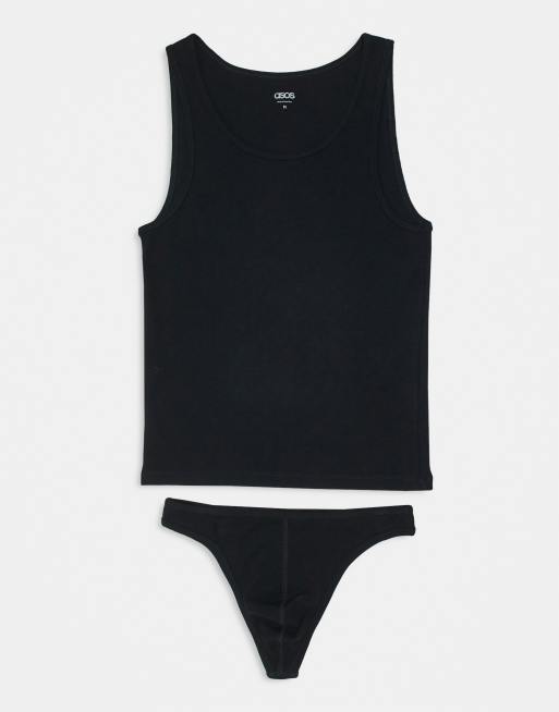 ASOS DESIGN rib thong and vest set in black