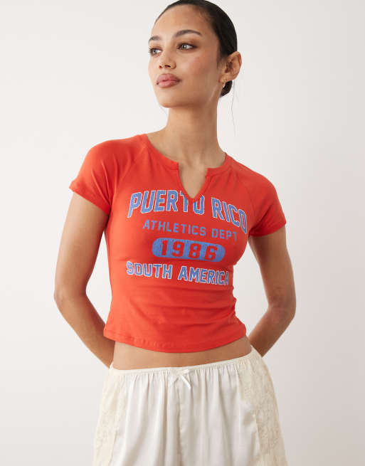 ASOS DESIGN ribbed baby tee with Puerto Rico athletics graphic in red