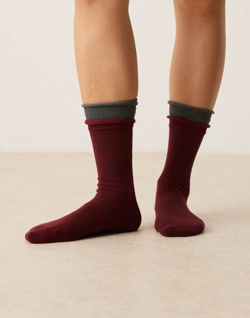 ASOS DESIGN ribbed socks with layered soft frill top in burgundy and grey