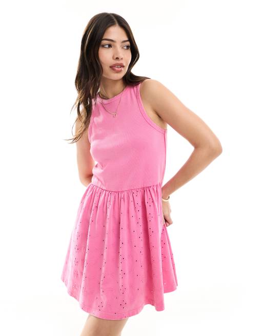 ASOS DESIGN ribbed tank midi dress with broderie skirt in pink