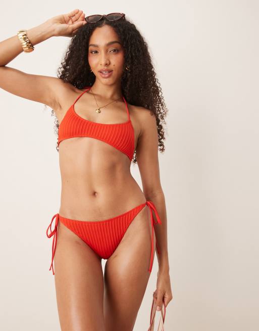 ASOS DESIGN Riddy rib high leg tie side bikini bottom in red