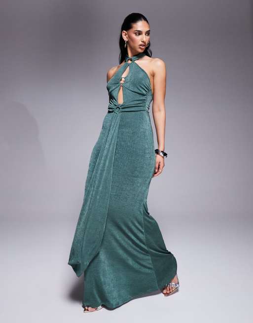 ASOS DESIGN ring detail maxi dress with tie back and sash in khaki