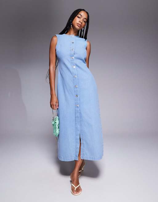 ASOS DESIGN round neck denim maxi dress with button front opening in bleach
