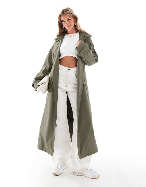 ASOS DESIGN rubberised rain hooded trench coat with belt detail in khaki