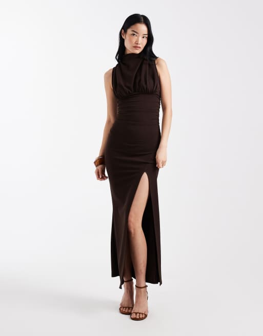 ASOS DESIGN ruched bodice maxi dress with grown on neck in chocolate