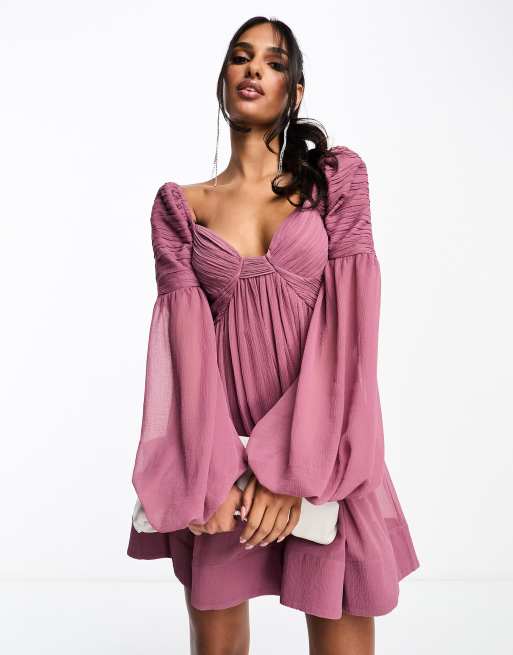 ASOS DESIGN ruched long sleeve mini babydoll dress in purple