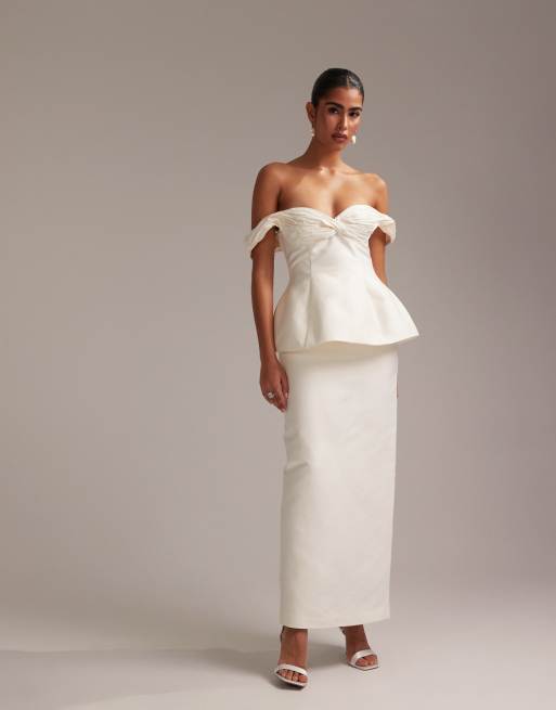 ASOS DESIGN ruched off shoulder structured midaxi wedding dress in ivory