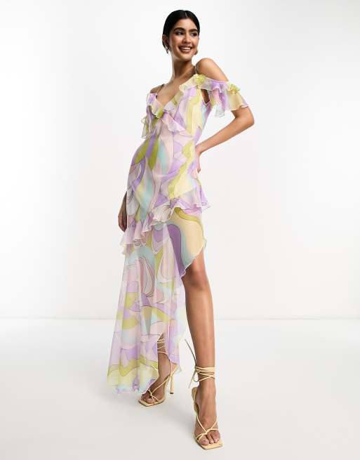 ASOS DESIGN ruffle asymmetric maxi dress in abstract print