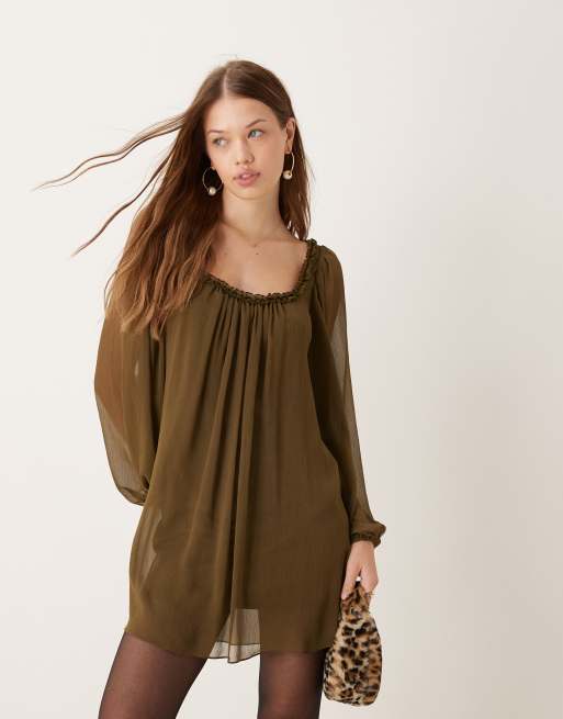 ASOS DESIGN ruffle neck mini smock dress in khaki