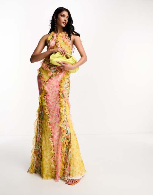 ASOS DESIGN ruffle racer neck maxi dress in colourblock floral print