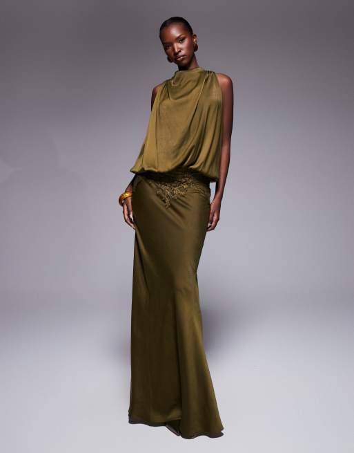 ASOS DESIGN satin blouson bodice maxi dress with lace applique in khaki