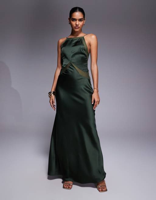 ASOS DESIGN satin chiffon mix square high neck maxi dress in dark green