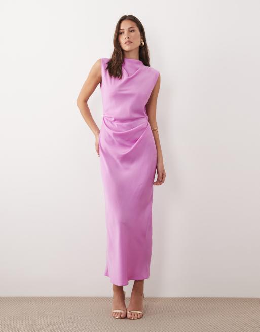 ASOS DESIGN satin high neck pleated bodice midi dress in pink lilac