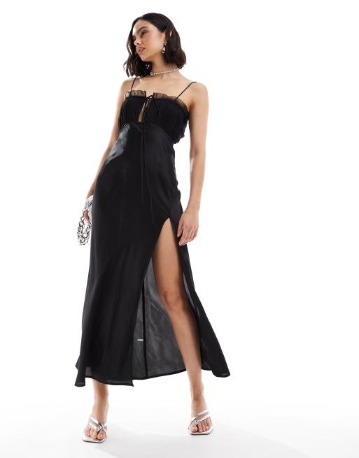 ASOS DESIGN satin midi dress with ruched chiffon bust detail in black