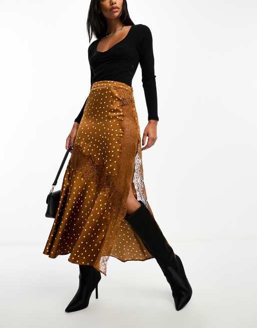 ASOS DESIGN satin midi slip skirt with lace inserts in rust polka dot