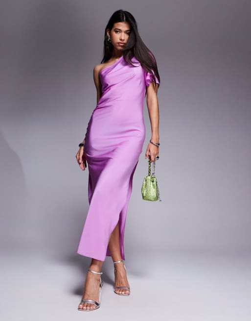 ASOS DESIGN satin one shoulder flutter sleeve midi dress in pink lilac