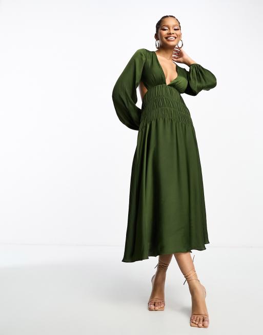 ASOS DESIGN satin shirred waist midi dress with blouson sleeves in pine green
