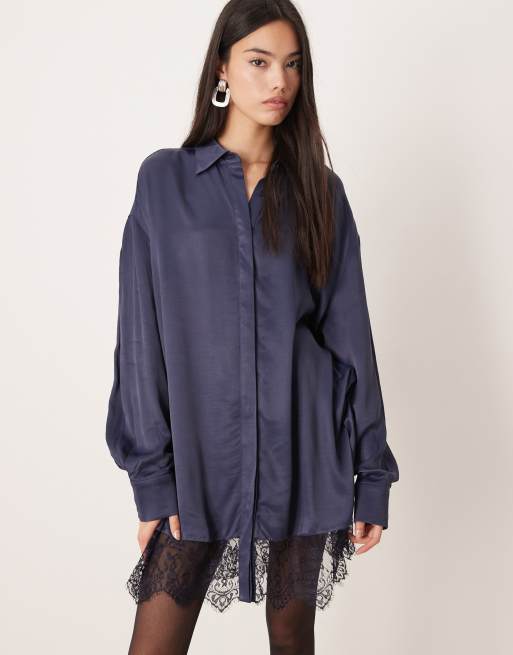 ASOS DESIGN satin shirt mini dress with high low curved hem in deep navy