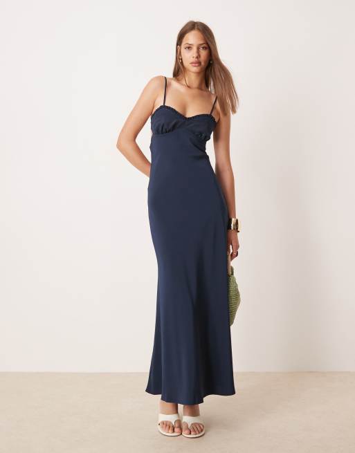 ASOS DESIGN satin slip cami open back maxi dress in navy