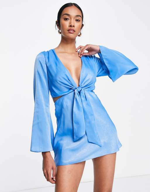 ASOS DESIGN satin tie front mini dress with fluted sleeve in blue
