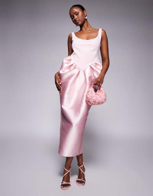 ASOS DESIGN scoop neck midi dress with manipulated puff skirt in pale pink in scuba-style fabric