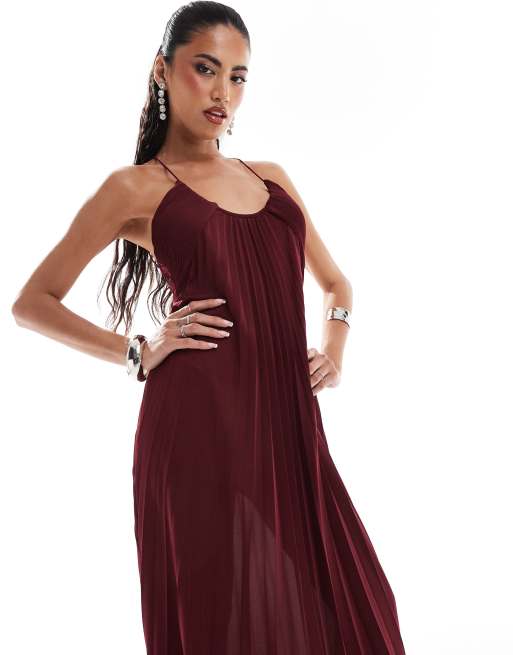 ASOS DESIGN scooped out halter pleated maxi dress in berry