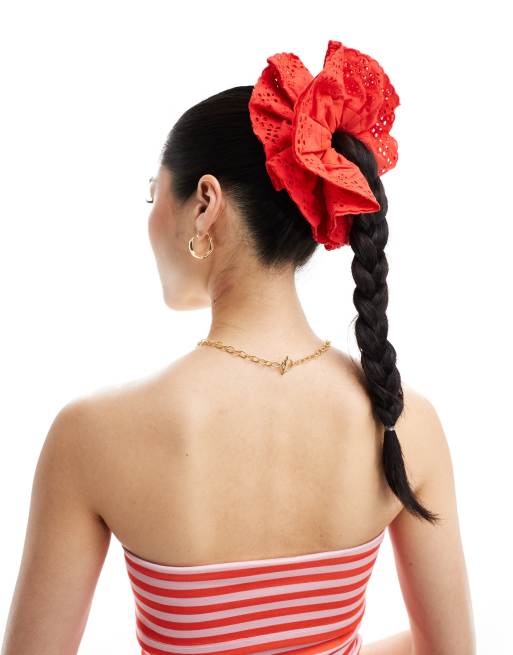 ASOS DESIGN scrunchie hair tie with broderie design in red