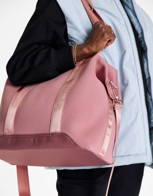 ASOS DESIGN scuba-style fabric holdall with rose gold hardware in mauve