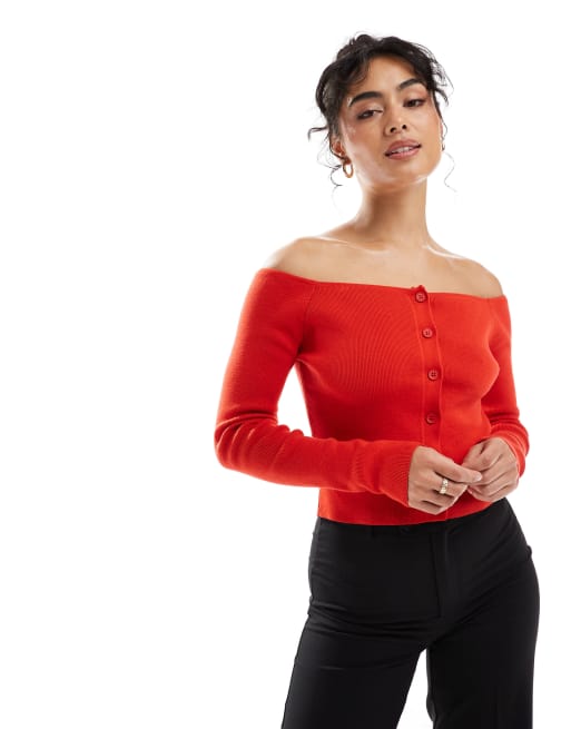 ASOS DESIGN sculpted knit button through bardot top in red