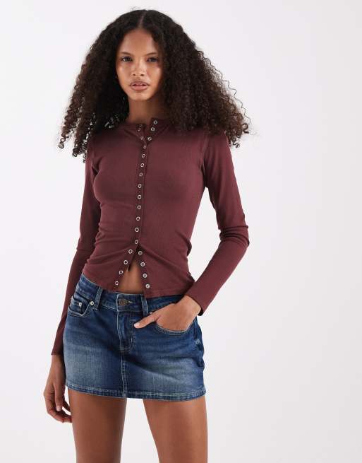 ASOS DESIGN seamless rib popper detail long sleeve top in chocolate