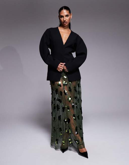 ASOS DESIGN sequin embellished lace godet maxi skirt in olive