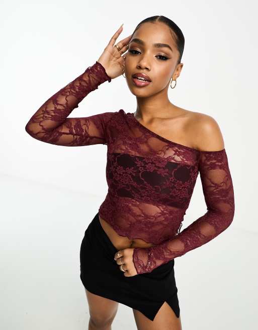 ASOS DESIGN sheer lace asymmetric top in burgundy red