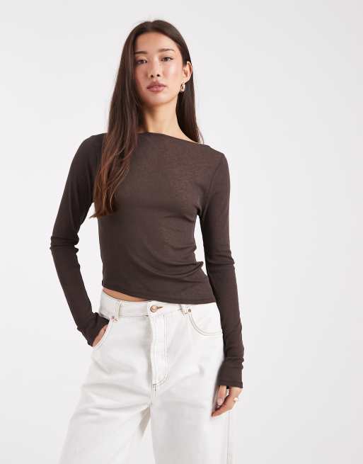 ASOS DESIGN sheer mesh long sleeve top with asymmetric hem in brown