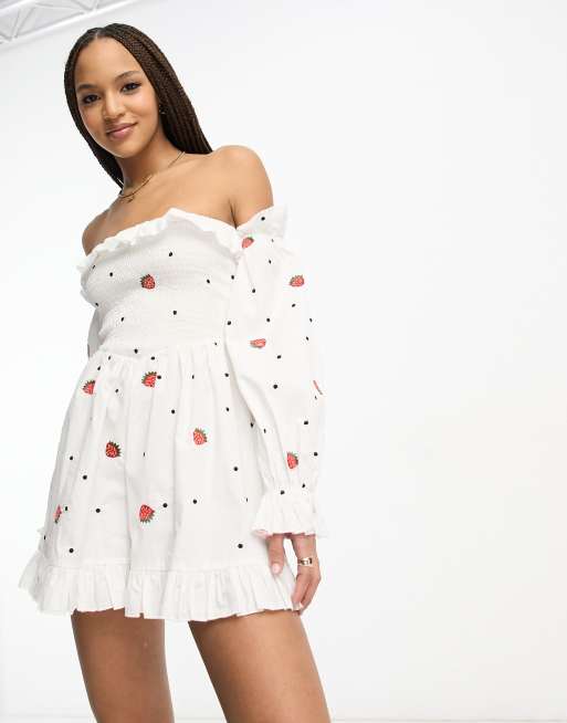 ASOS DESIGN shirred bodice playsuit with strawberry embroidery