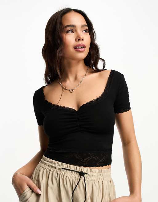 ASOS DESIGN short sleeve crop top with lace trim in black