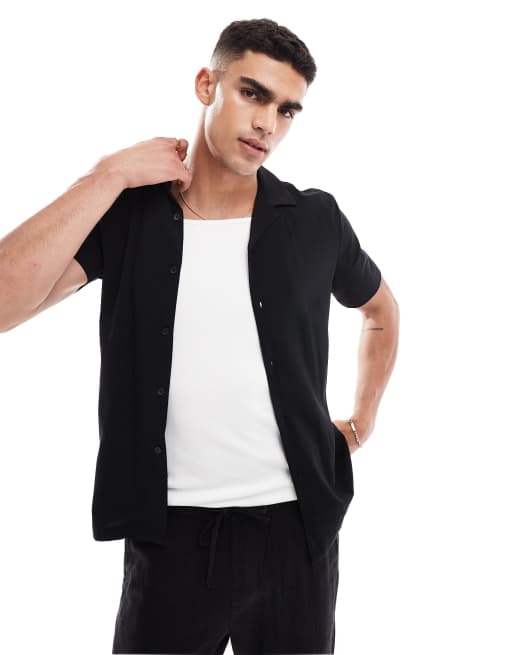ASOS DESIGN short sleeve deep revere muscle viscose shirt in black