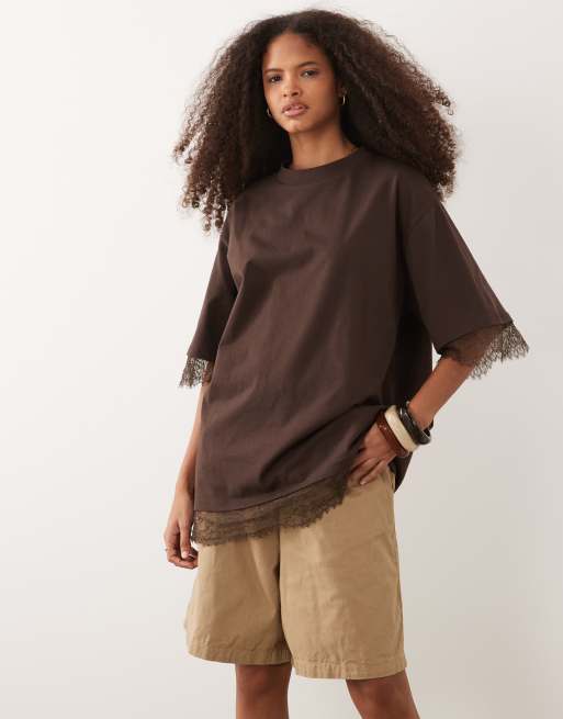 ASOS DESIGN short sleeve oversized T-shirt with lace in brown