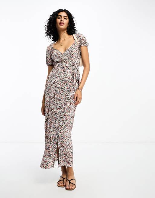 ASOS DESIGN short sleeve plisse wrap midi dress with side tie in black ditsy floral