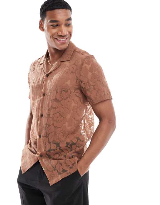 ASOS DESIGN short sleeve regular revere collar shirt in floral burn out in brown